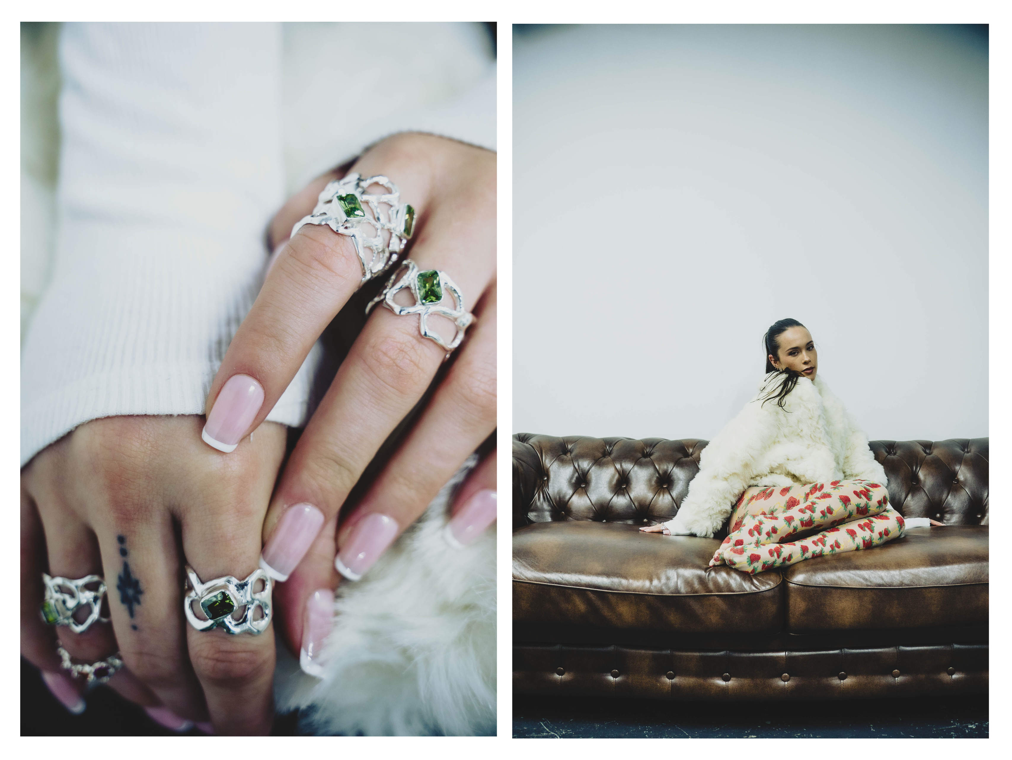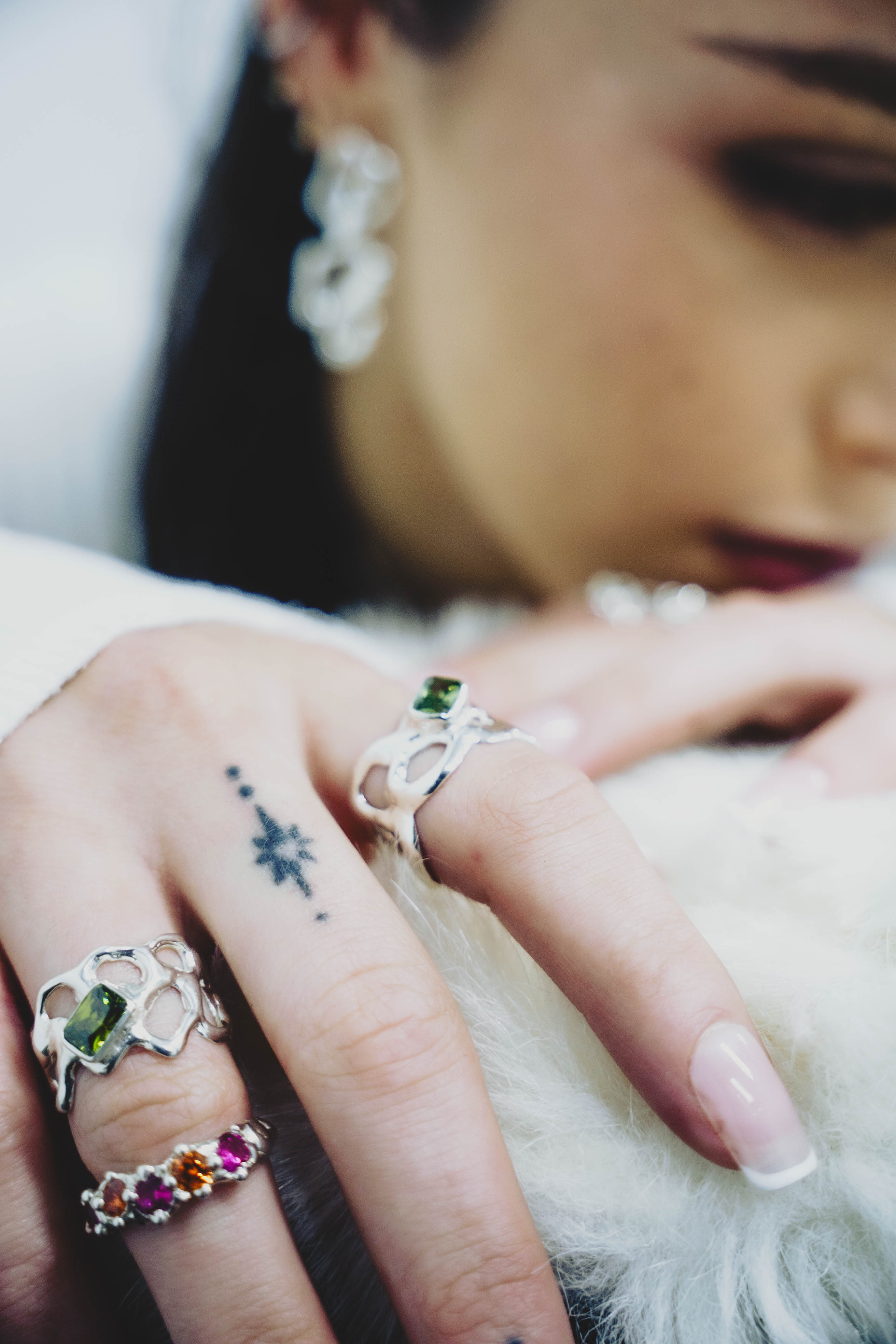 A ring that is an experimental exploration in flowing metal forms. Fluid open work sterling silver, set with a faceted moss green cubic zirconia gemstone at it's heart. Each ring is a one of a kind free form study in movement & structure, like molten metal captured in mid flow