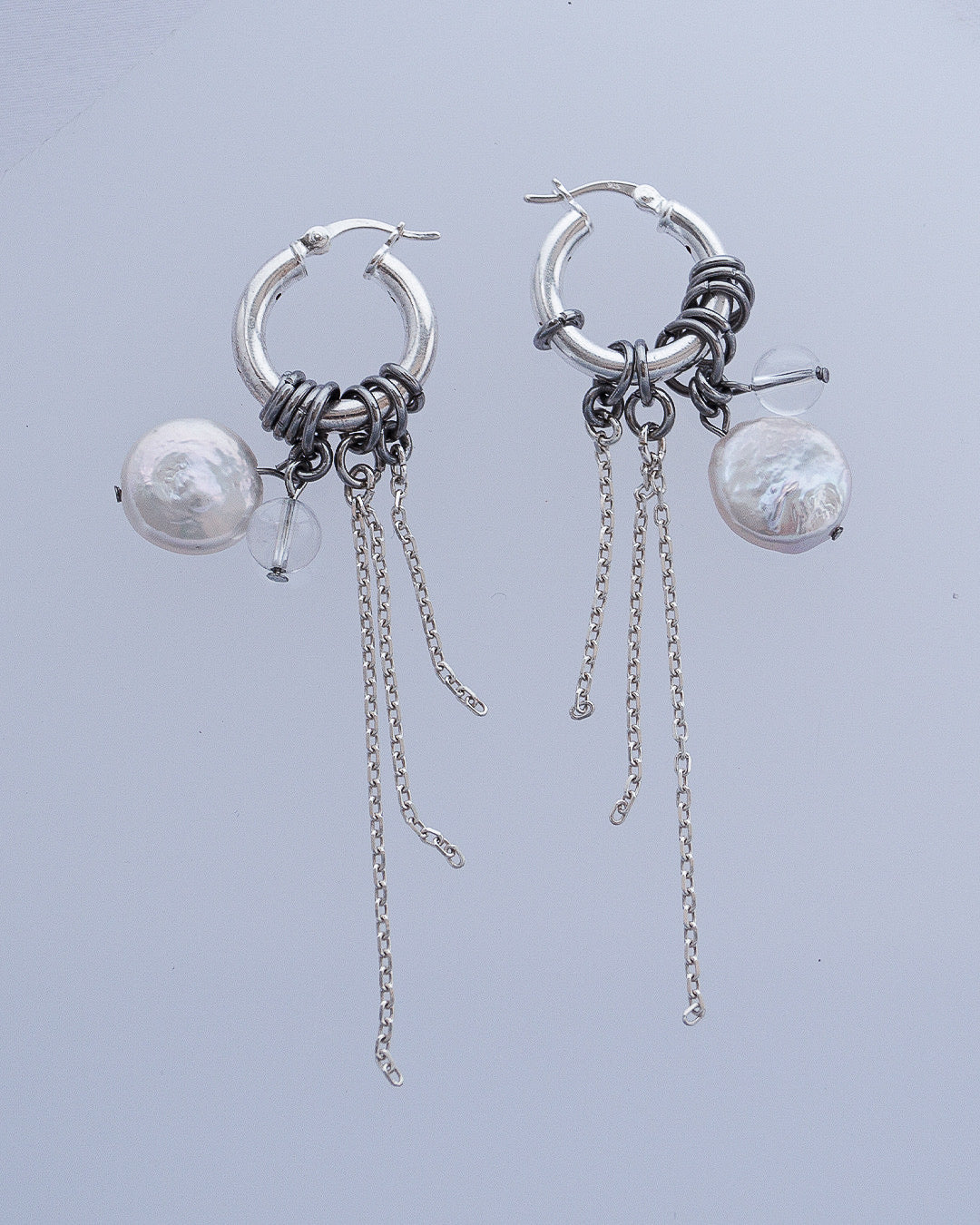 Features hollow hoop, chains, freshwater pearls. Please choose either rose quartz, clear quartz or blue lace agate beads