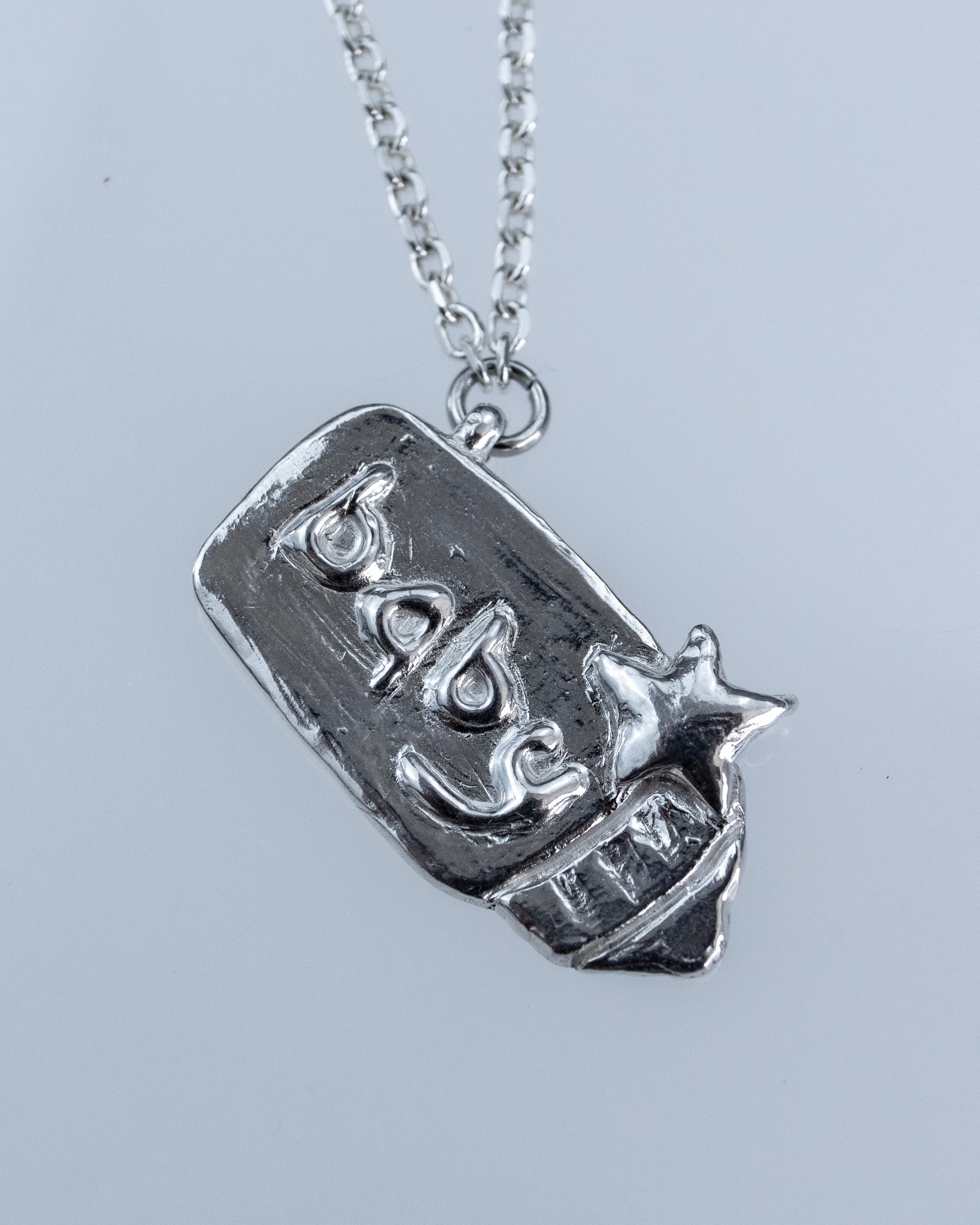 A playful & lighthearted XL charm pendant, featuring soft, puffy baby lettering pressed into a bottle & star. For those days where we feel softies, like a lil big baby