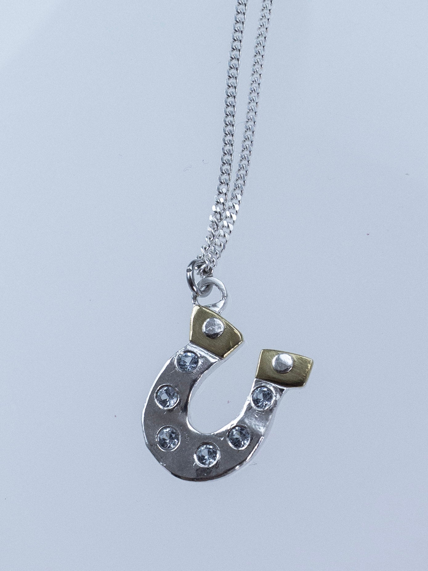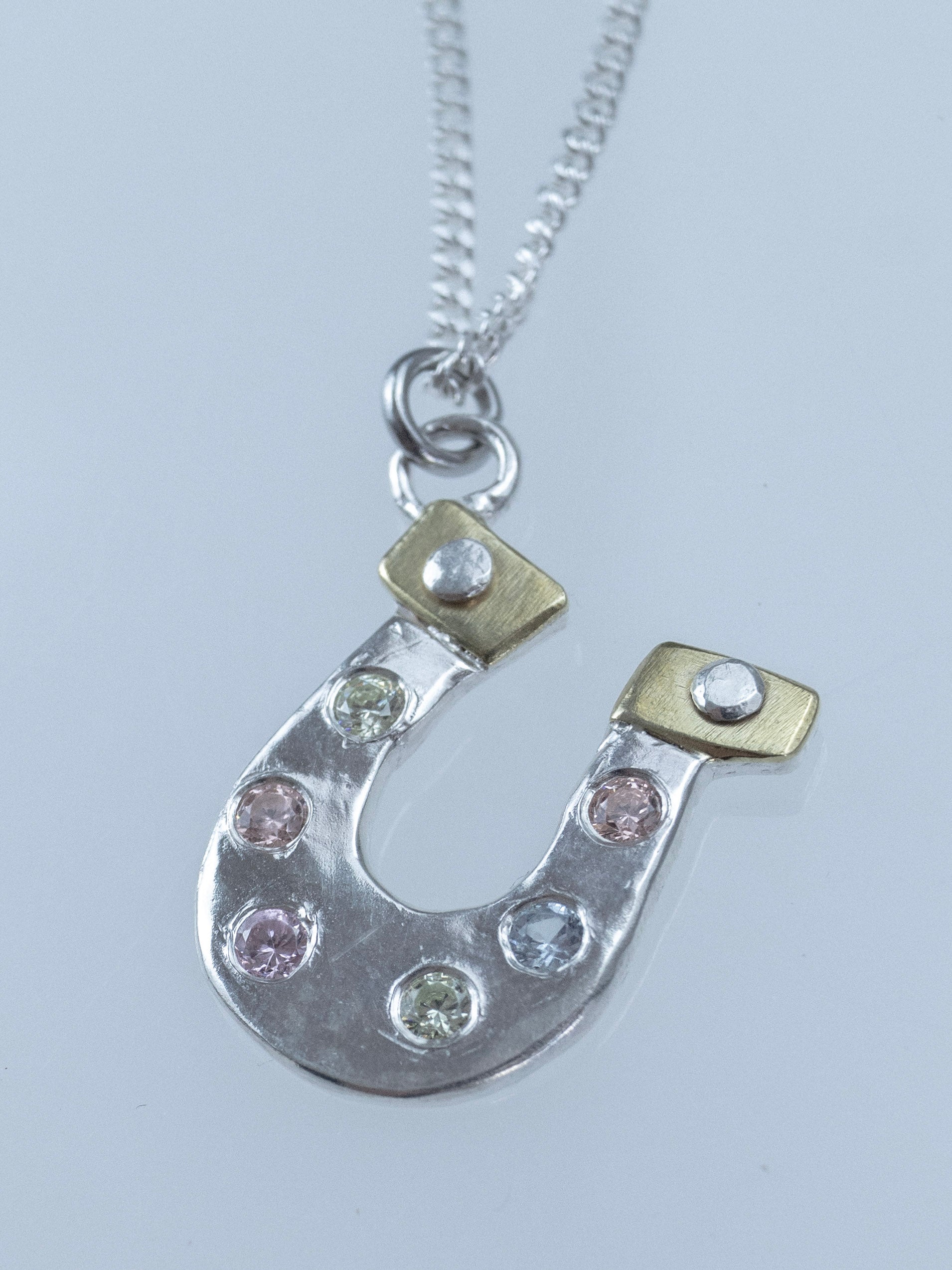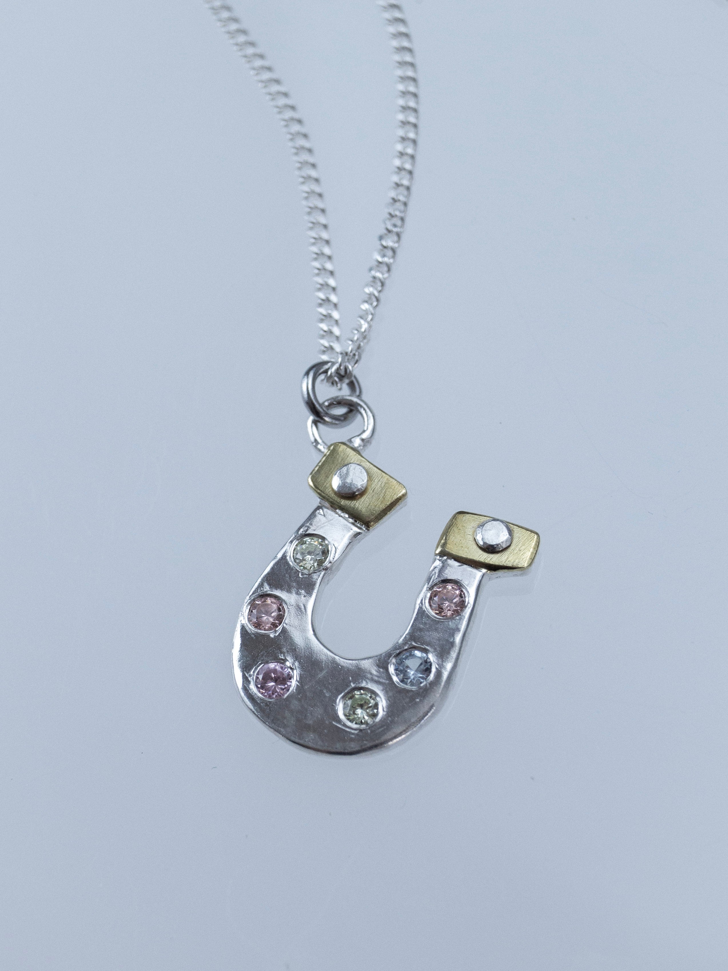 A playful two toned lucky horseshoe necklace. A detailed piece featuring textured sterling silver horse shoe, brass tops finished & with silver rivets . Dotted with cubic zirconia gemstones in a baby blue or pastel mix colour way.