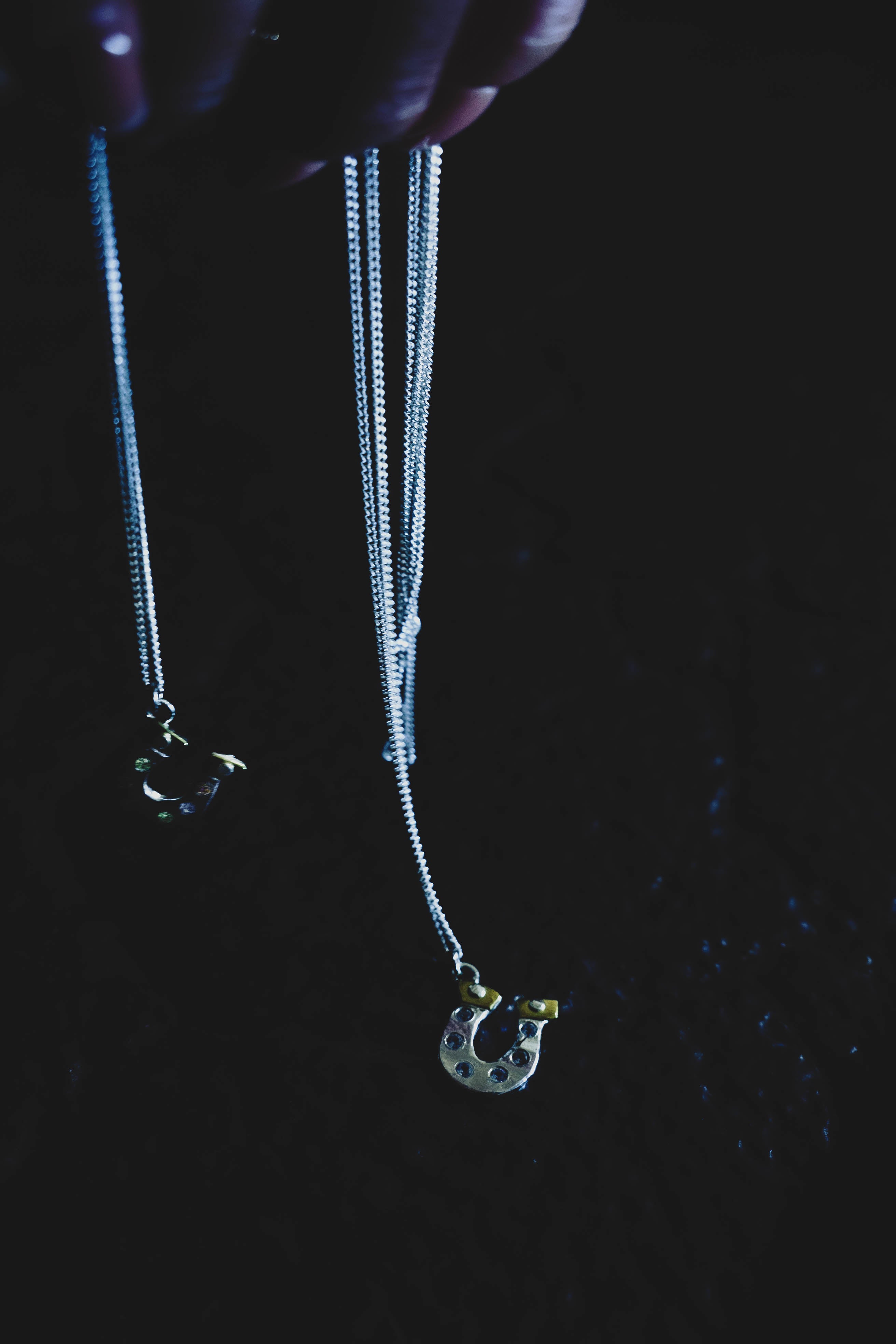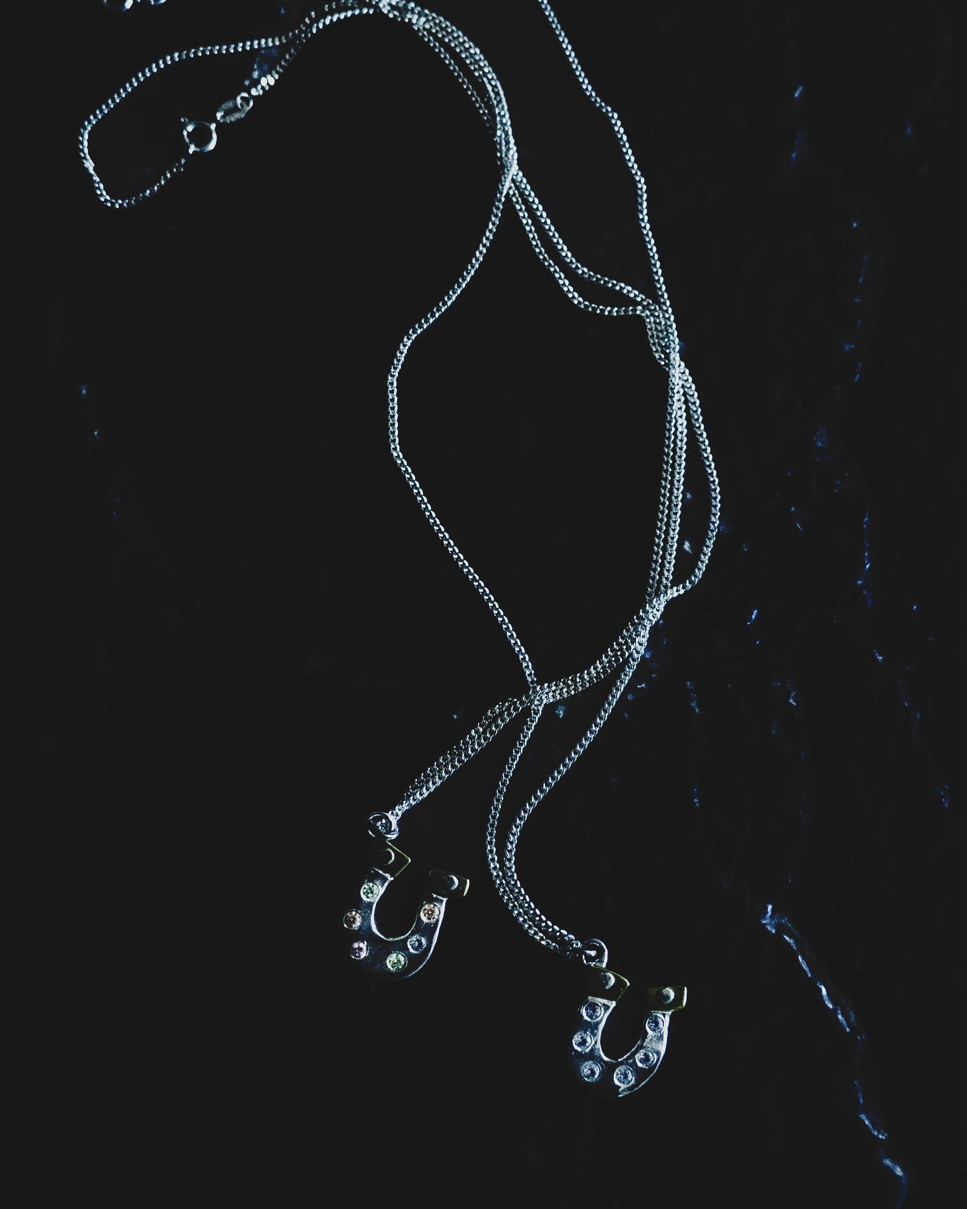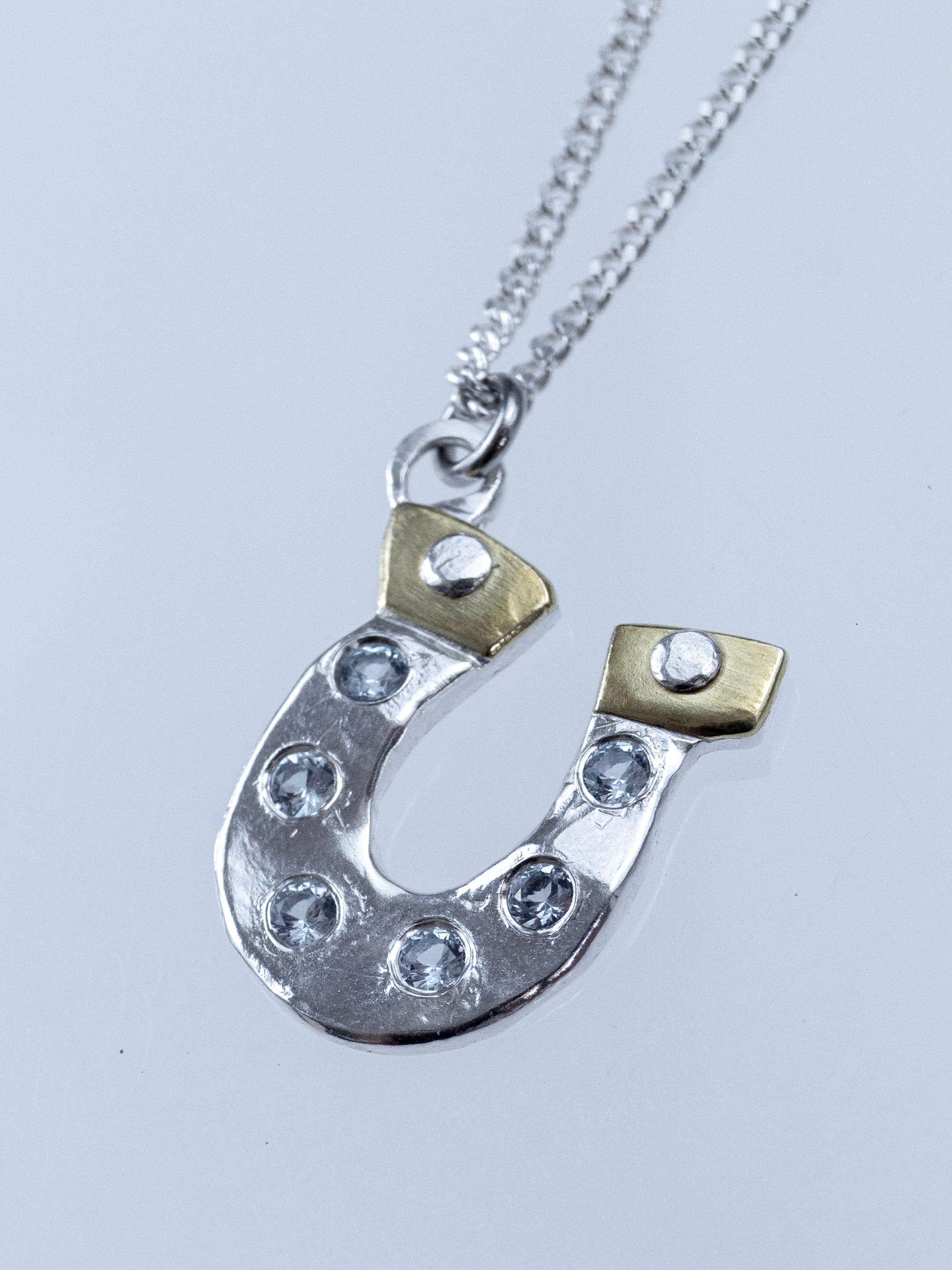 A playful two toned lucky horseshoe necklace. A detailed piece featuring textured sterling silver horse shoe, brass tops finished & with silver rivets . Dotted with cubic zirconia gemstones in a baby blue or pastel mix colour way.