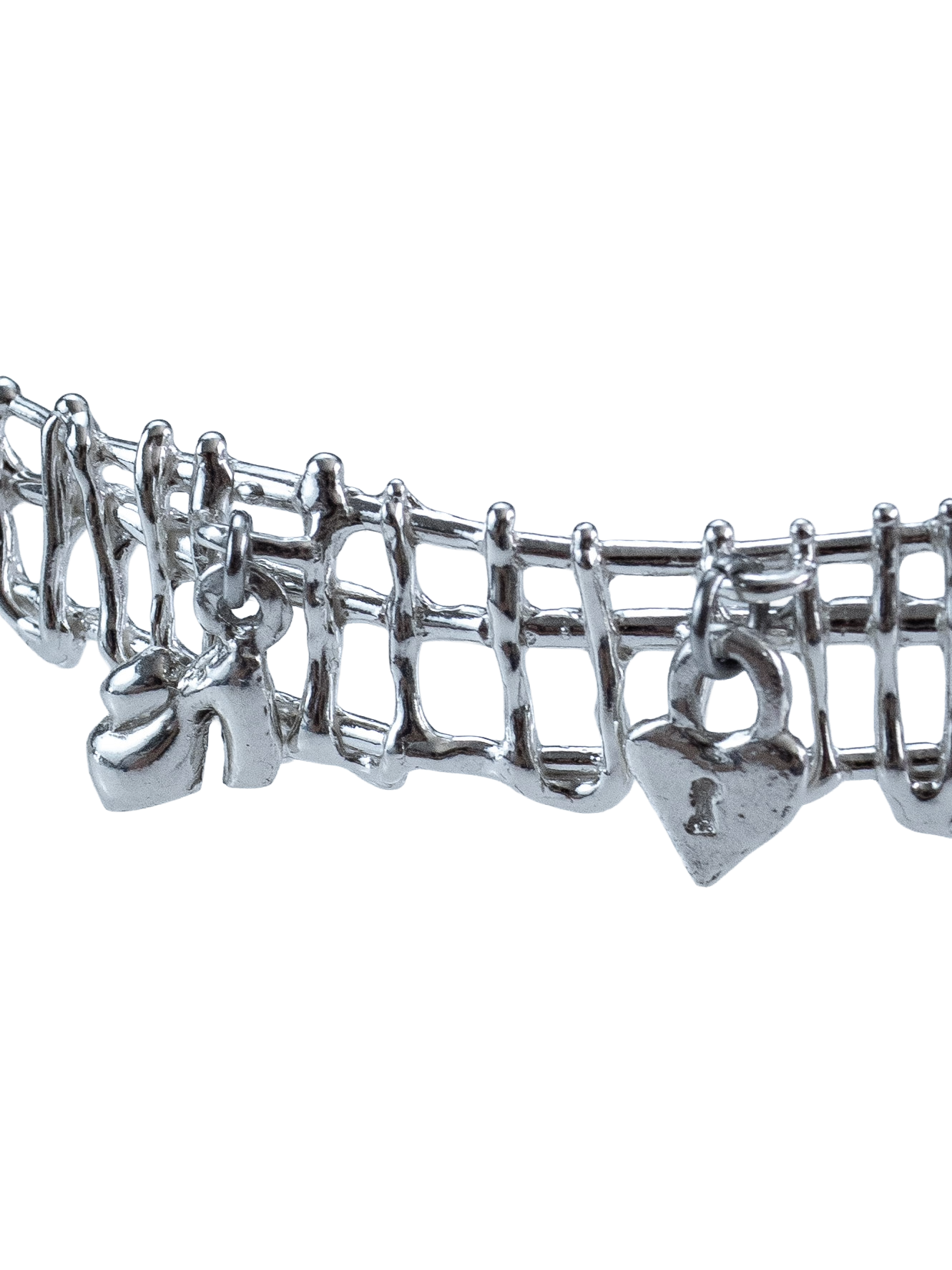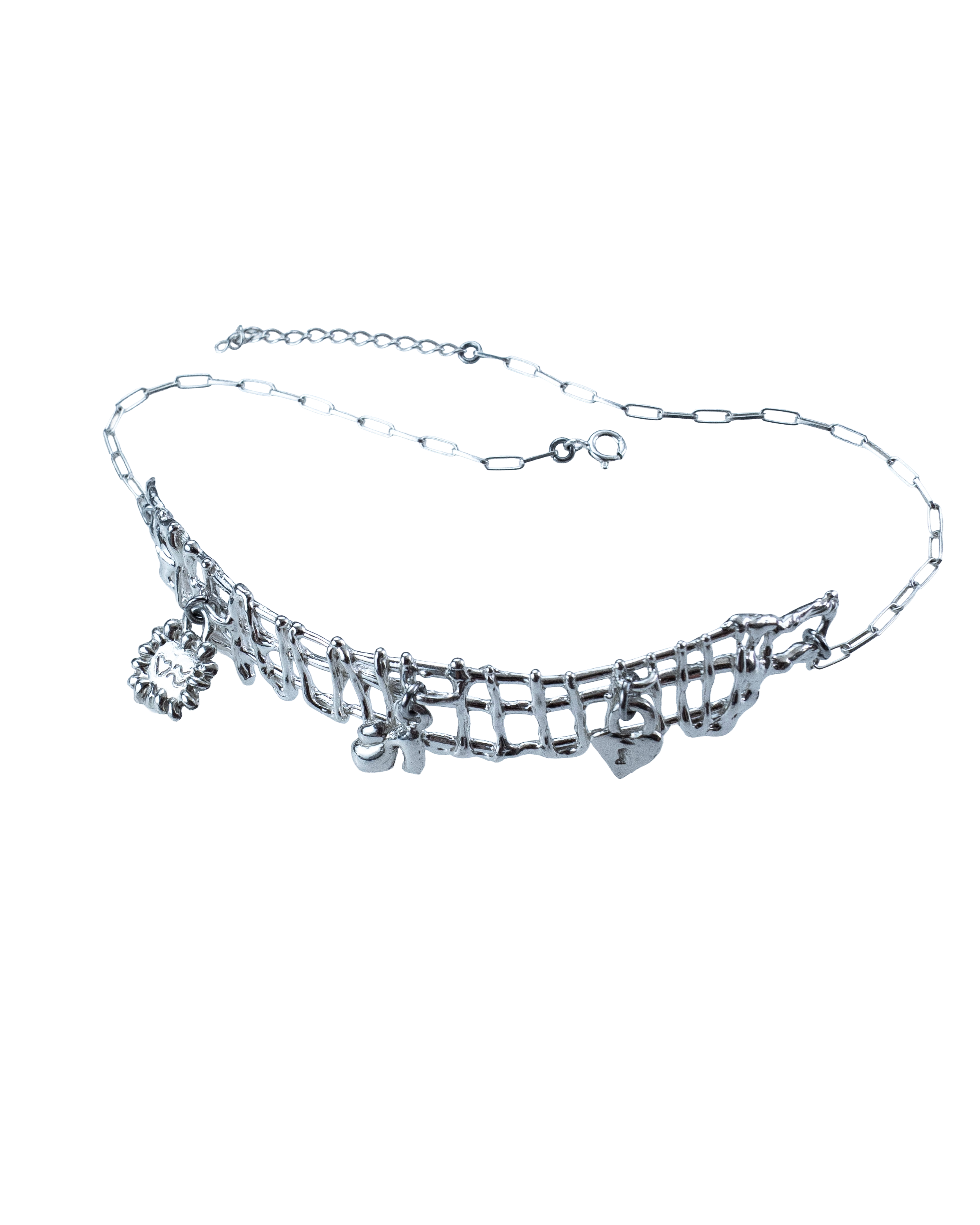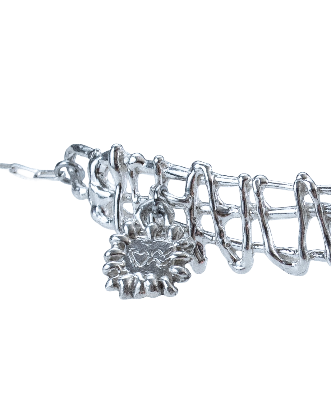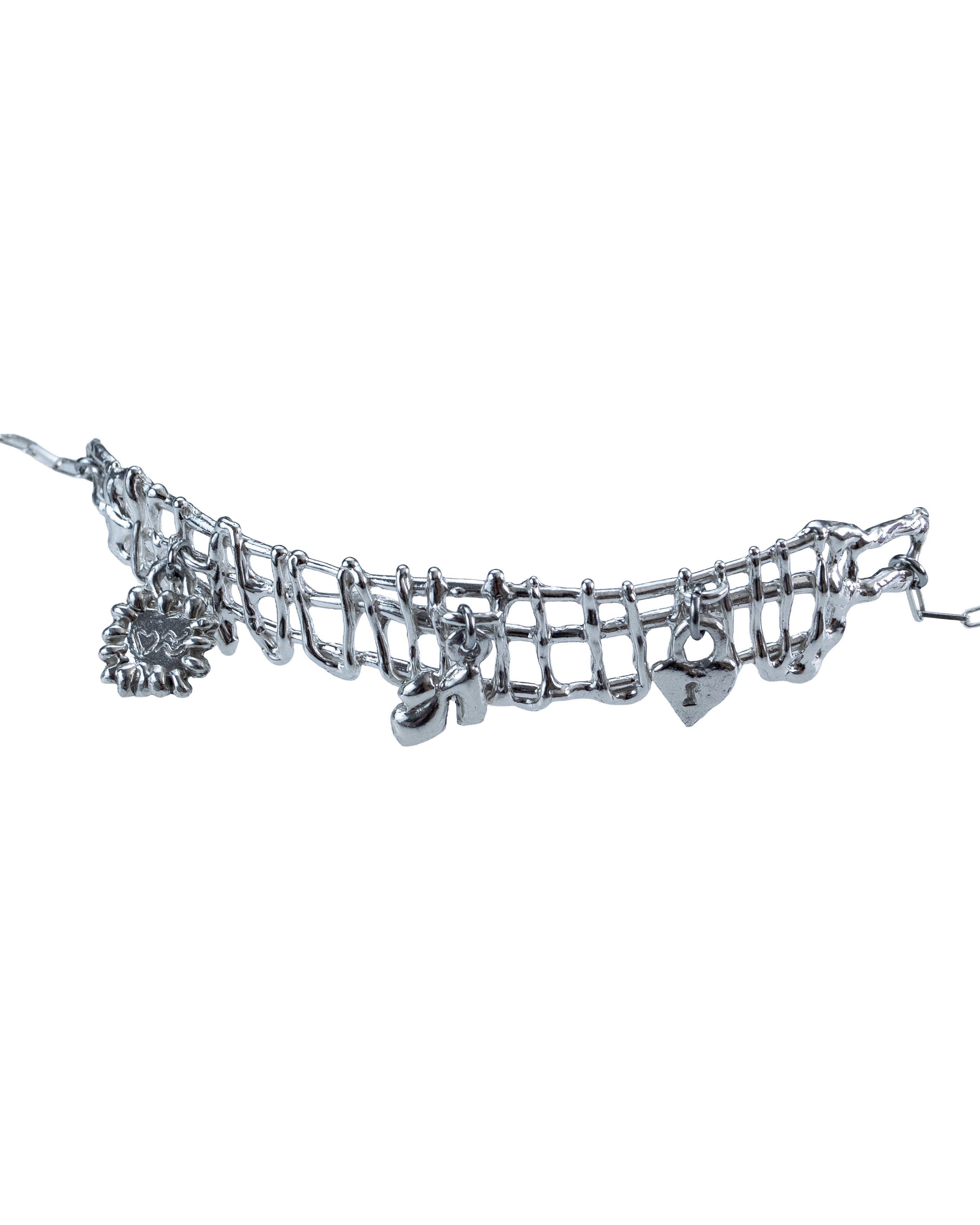 A piece that revisits the nostalgia of youthful keepsakes. Featuring playful, hand sculpted miniature charms, all adorned on the neckpiece that is reminiscent of a ribbon & gives the illusion of woven silver strands, a mix of metal meets fabric. It sits comfortably on top of the collarbones. A modern keepsake for the grown up dreamer.
