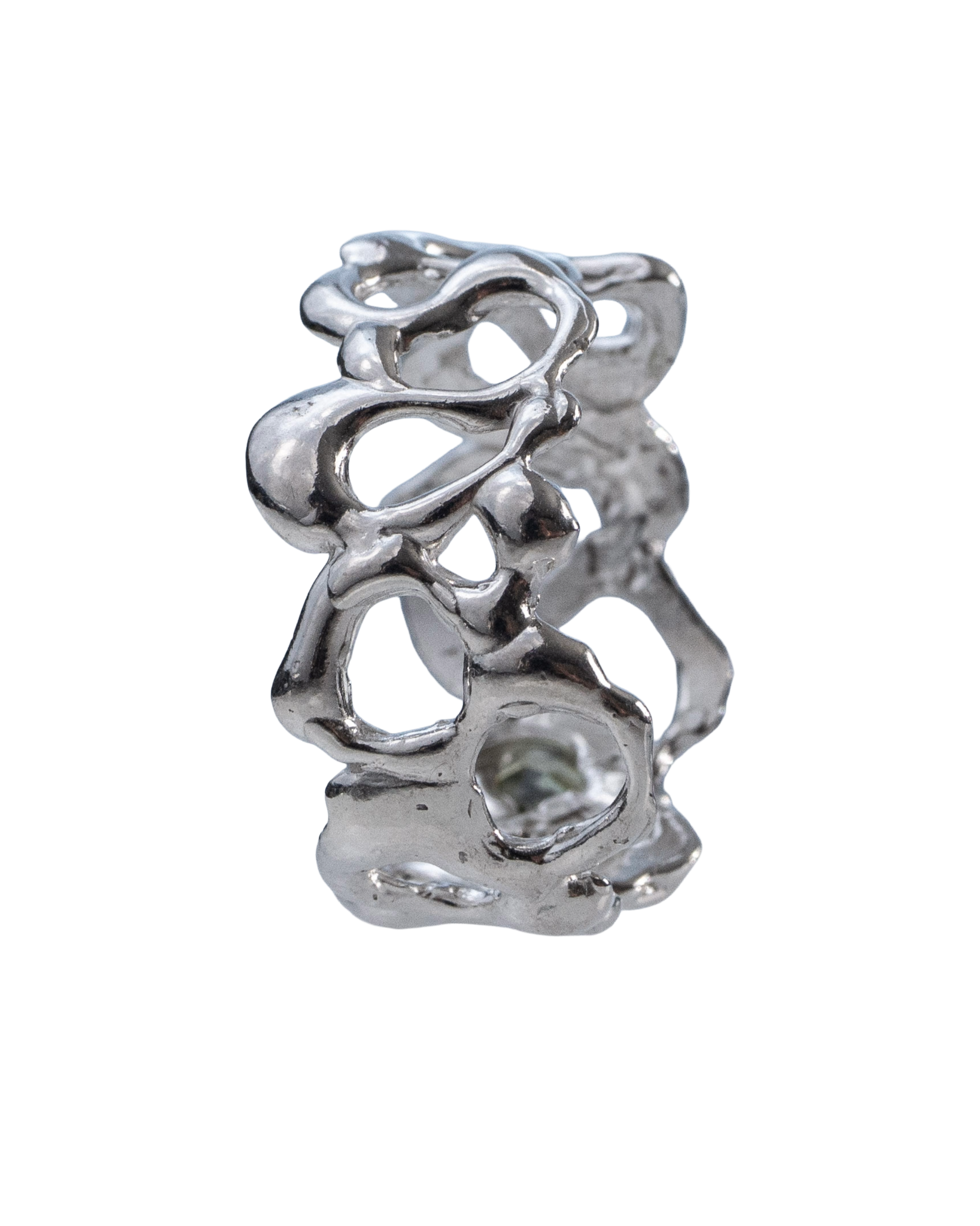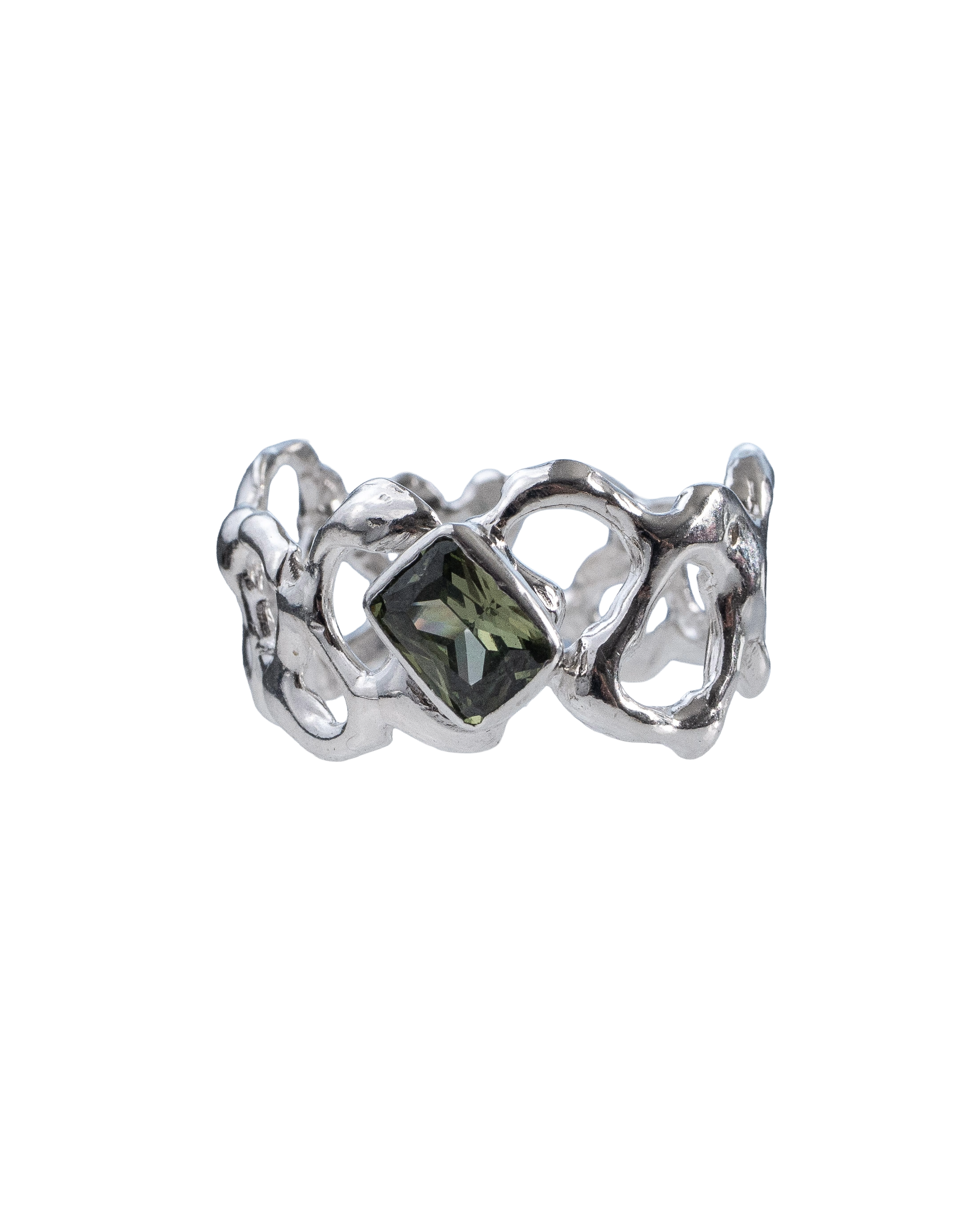 A ring that is an experimental exploration in flowing metal forms. Fluid open work sterling silver, set with a faceted moss green cubic zirconia gemstone at it's heart. Each ring is a one of a kind free form study in movement & structure, like molten metal captured in mid flow