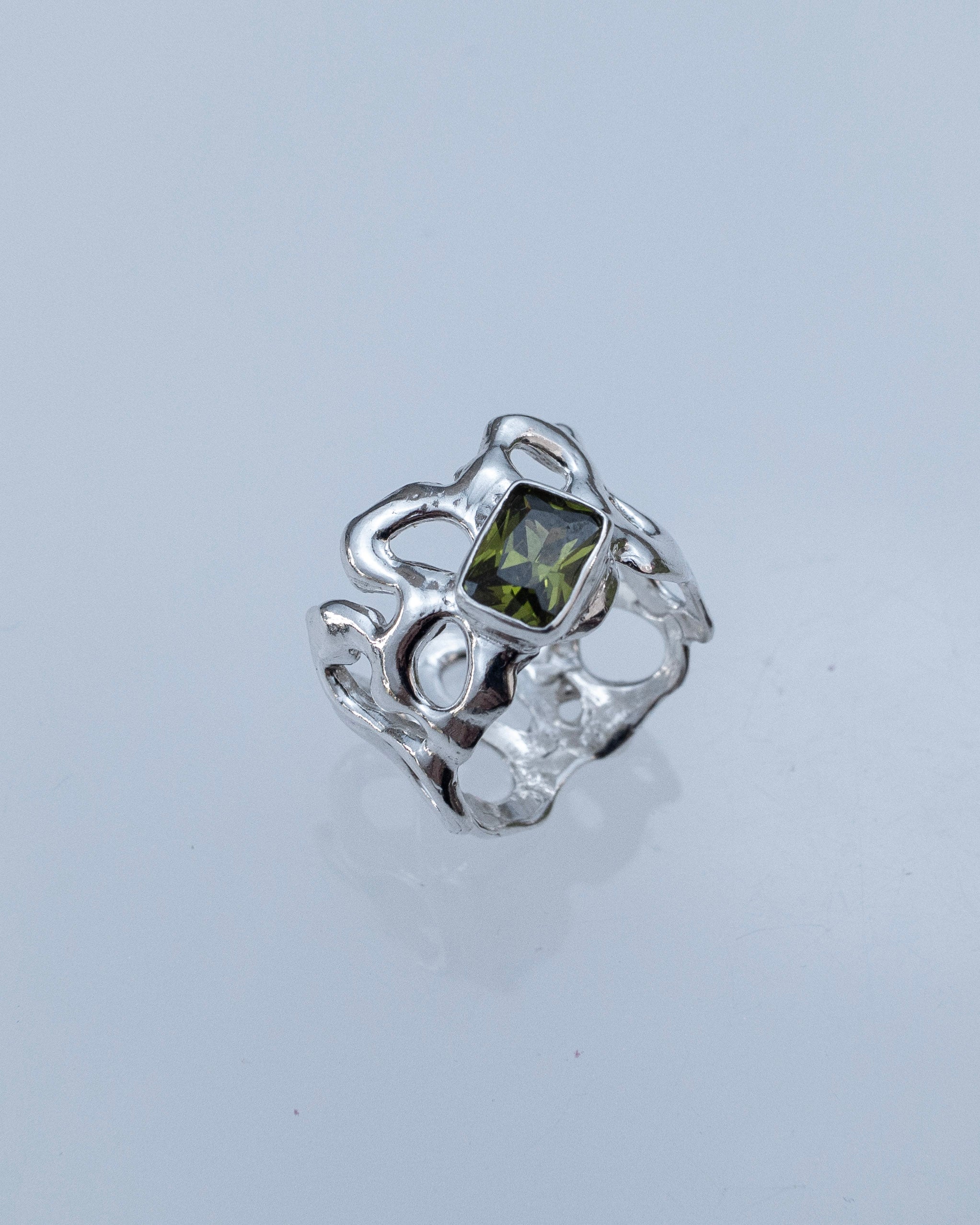 A ring that is an experimental exploration in flowing metal forms. Fluid open work sterling silver, set with a faceted moss green cubic zirconia gemstone at it's heart. Each ring is a one of a kind free form study in movement & structure, like molten metal captured in mid flow
