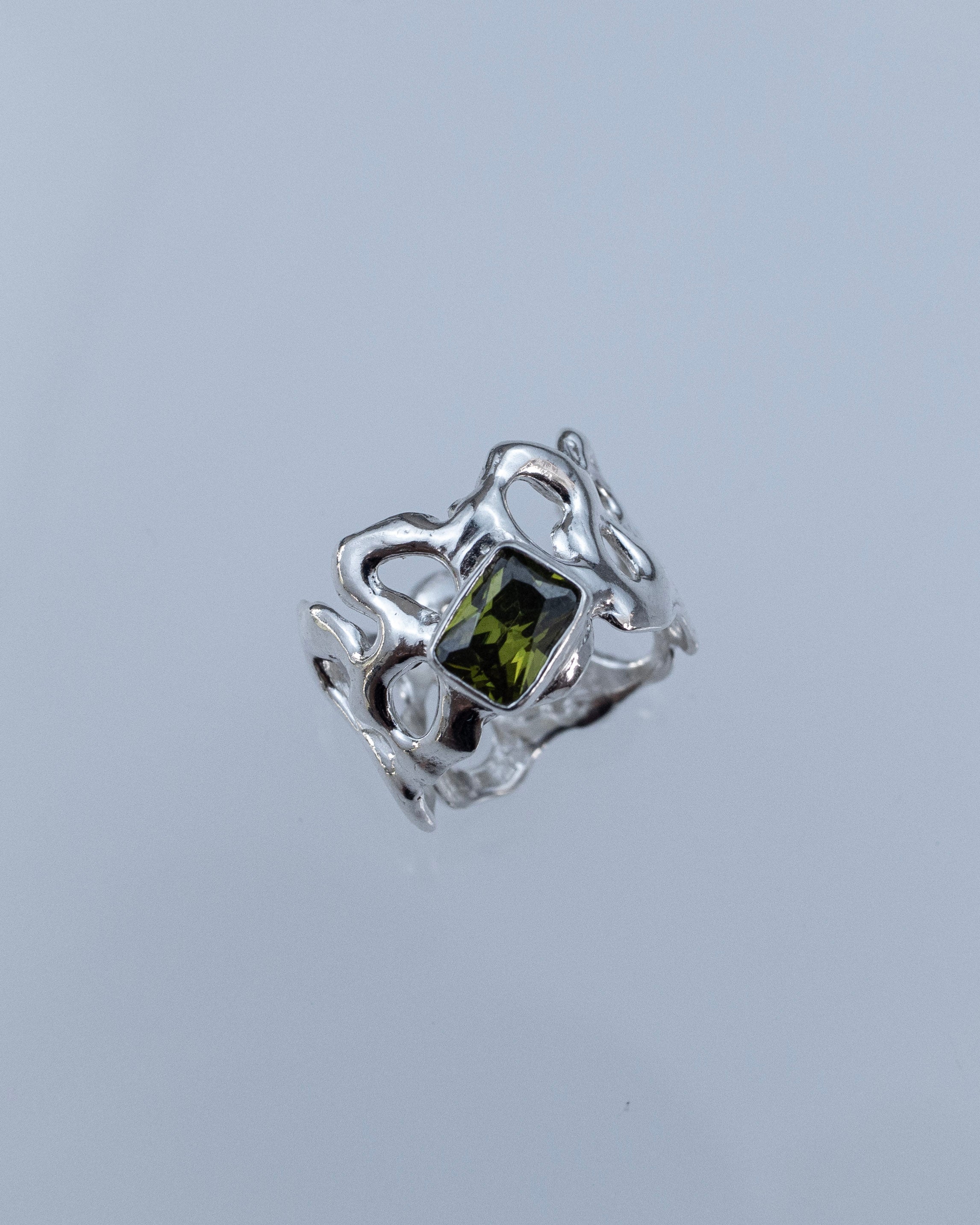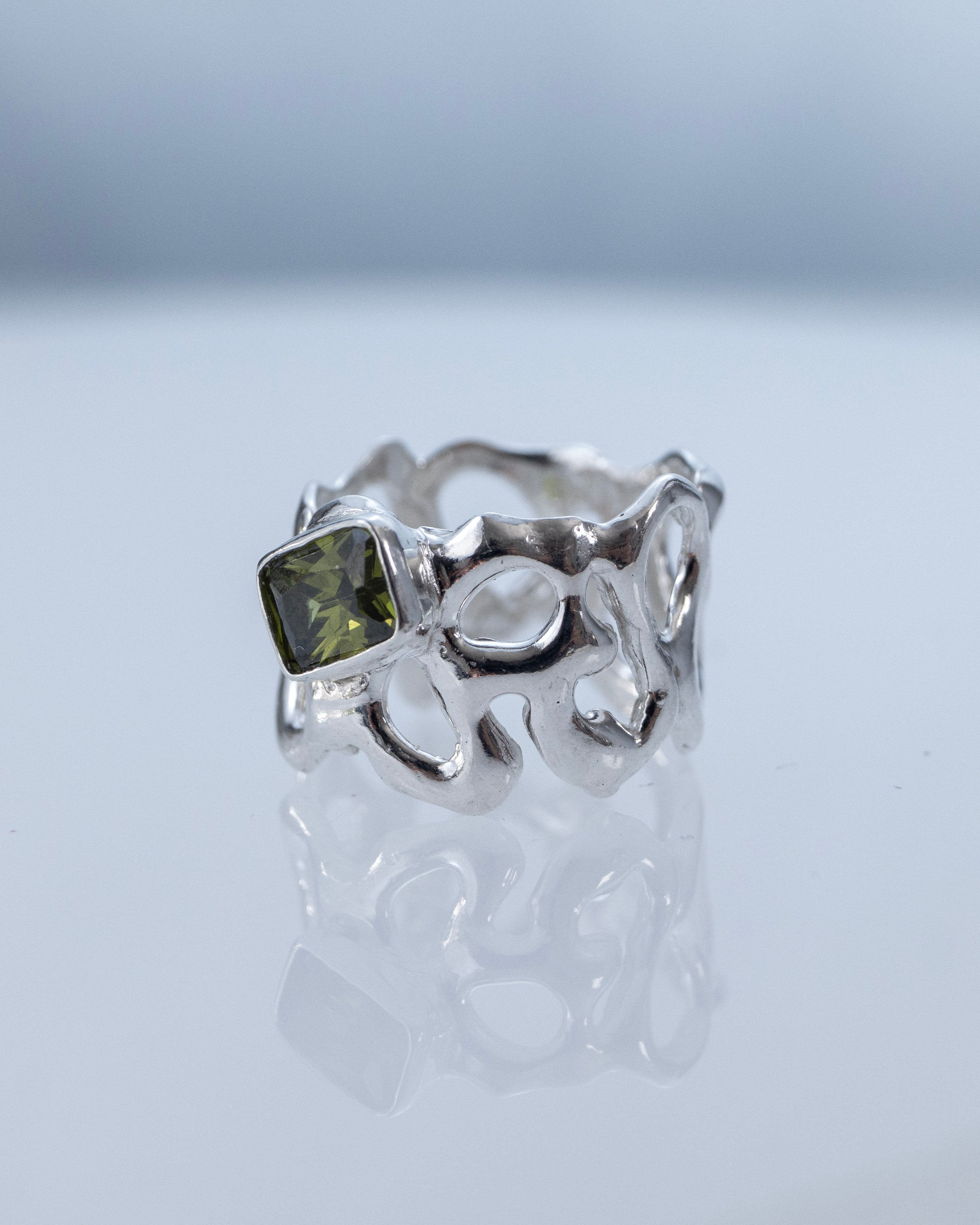 A ring that is an experimental exploration in flowing metal forms. Fluid open work sterling silver, set with a faceted moss green cubic zirconia gemstone at it's heart. Each ring is a one of a kind free form study in movement & structure, like molten metal captured in mid flow