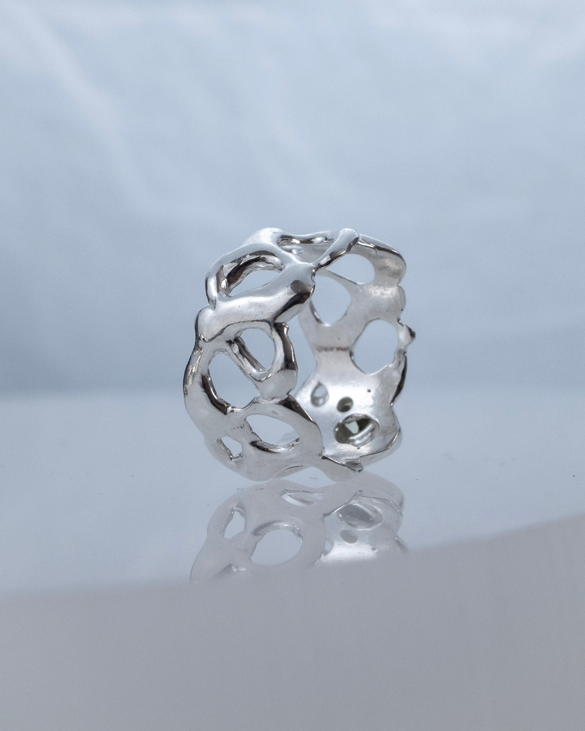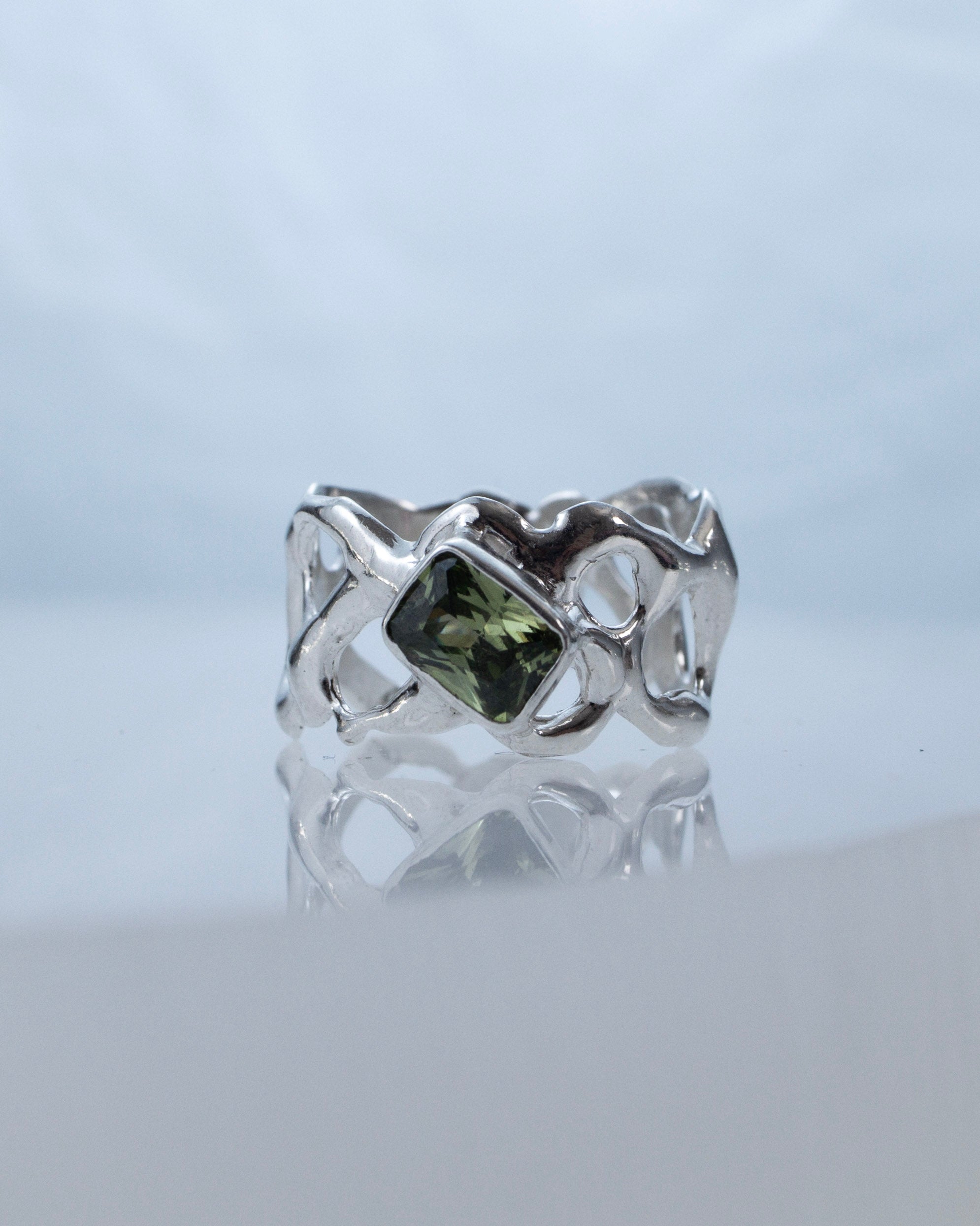 A ring that is an experimental exploration in flowing metal forms. Fluid open work sterling silver, set with a faceted moss green cubic zirconia gemstone at it's heart. Each ring is a one of a kind free form study in movement & structure, like molten metal captured in mid flow