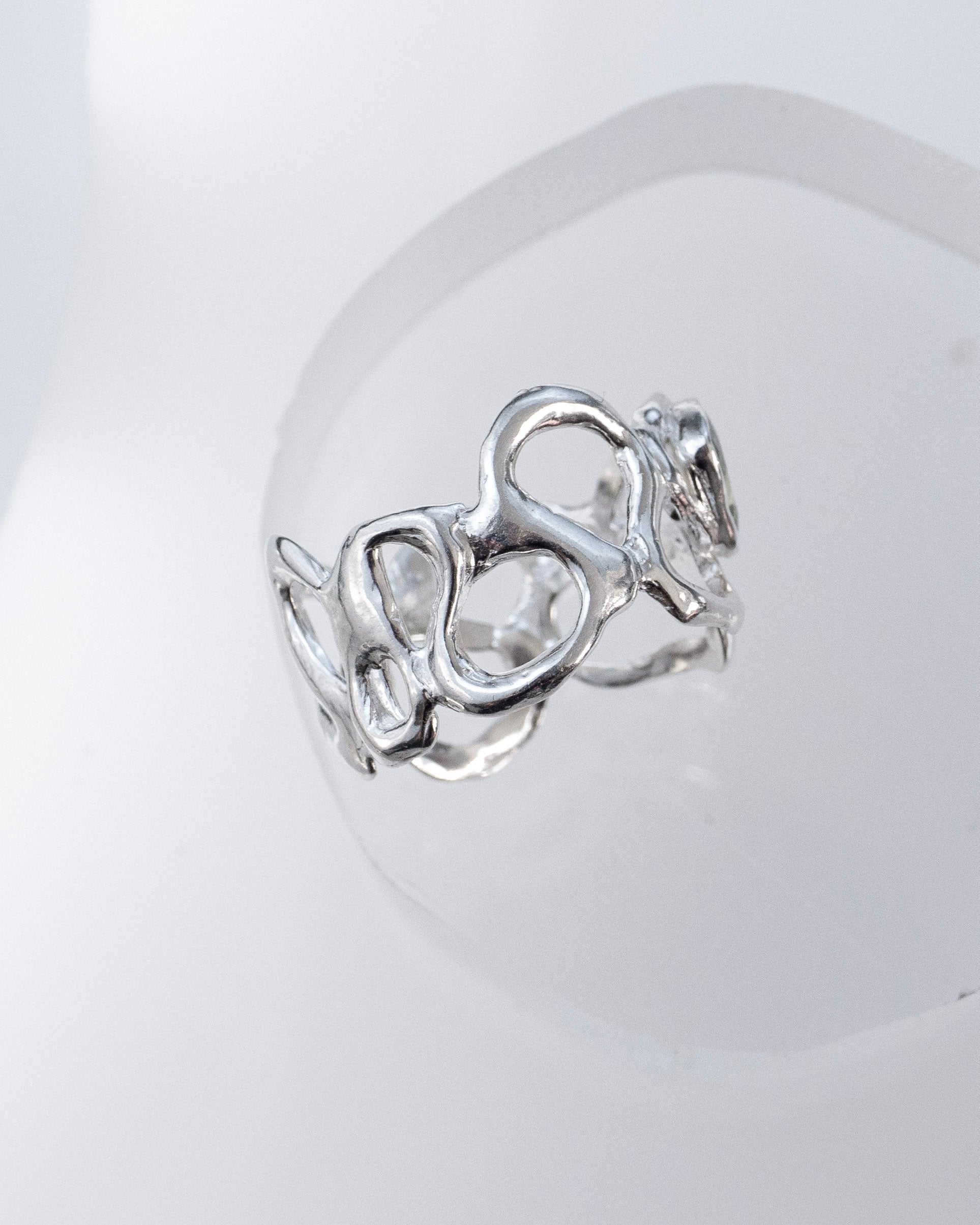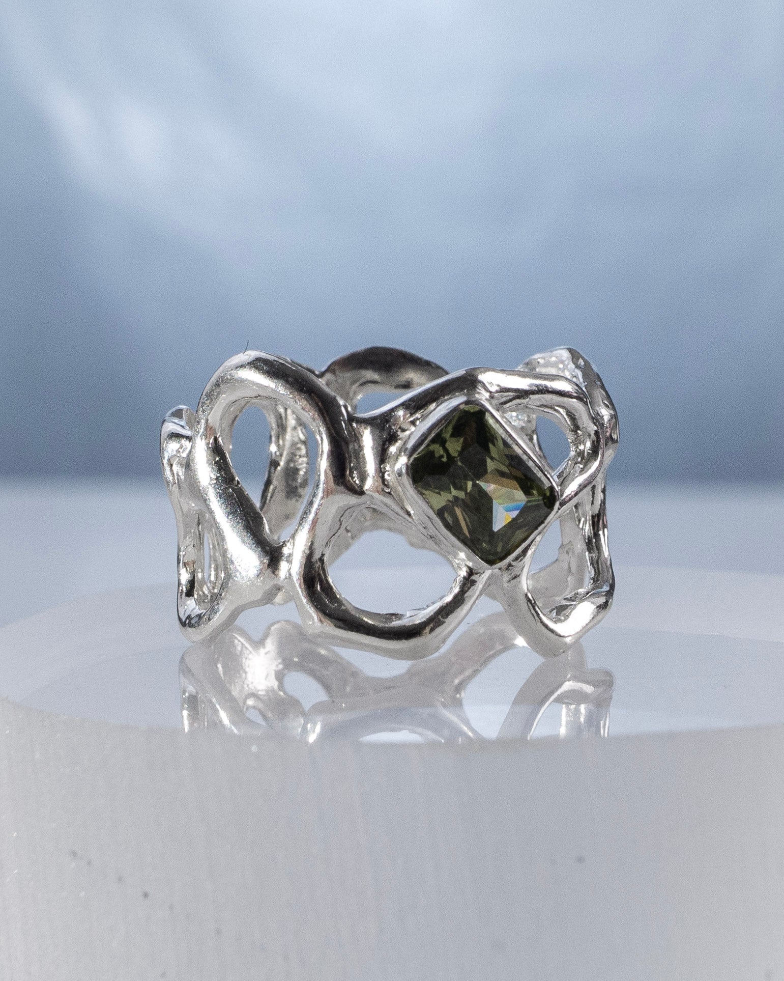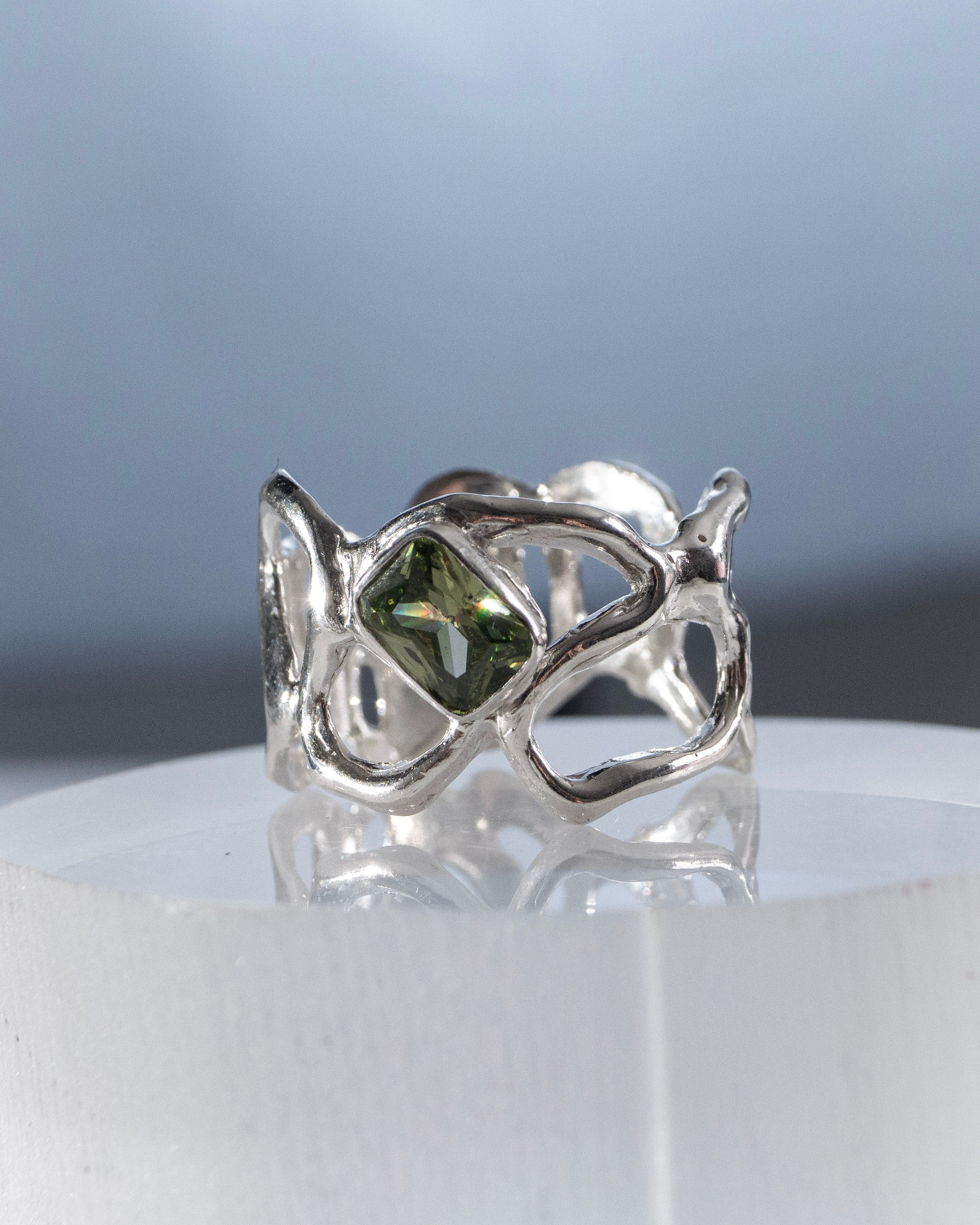 A ring that is an experimental exploration in flowing metal forms. Fluid open work sterling silver, set with a faceted moss green cubic zirconia gemstone at it's heart. Each ring is a one of a kind free form study in movement & structure, like molten metal captured in mid flow